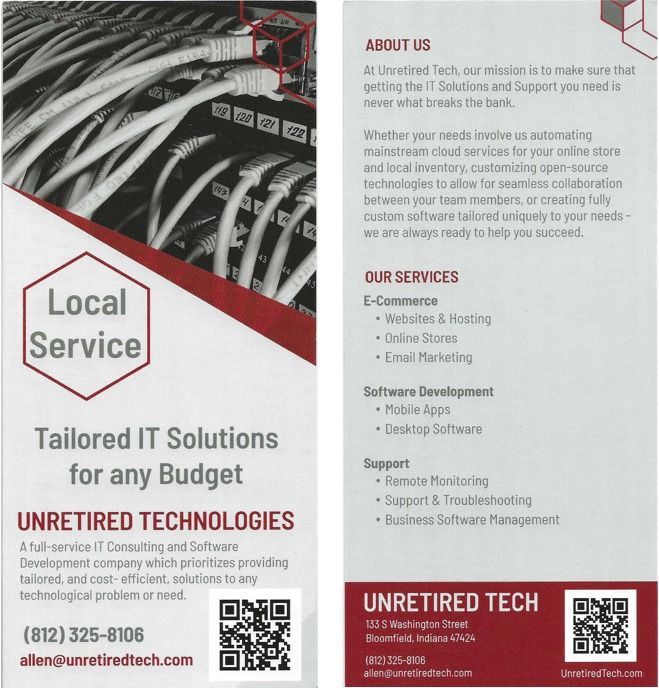 Unretired Technologies is your local destination for comprehensive IT services and tech solutions in Bloomfield, IN. We take pride in offering personalized and tailored solutions to meet your unique needs. As a locally owned and operated business, we understand the importance of community and strive to provide top-notch services with a personal touch. We've got your technology needs covered from software development to web hosting, website development, and mobile app development. Our team of experts is dedicated to delivering non-GMO internet connections, ensuring a secure and reliable online experience. Contact us today to schedule a consultation and experience the Unretired Technologies difference.